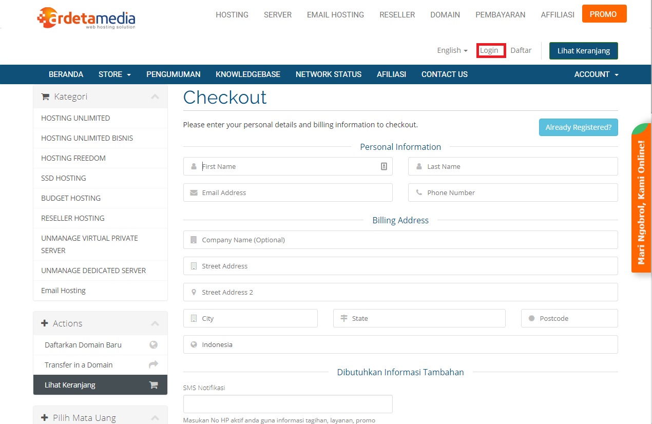 - Setelah Anda checkout maka akan akan diarahkan ke halaman untuk pengisian personal information dan lainnya. Silahkan diisikan sesuai dengan data diri Anda. Jika Anda sudah mempunyai account di Ardetamedia, silahkan klik menu “Account” di pojok kanan atas dan pilih “Login“.