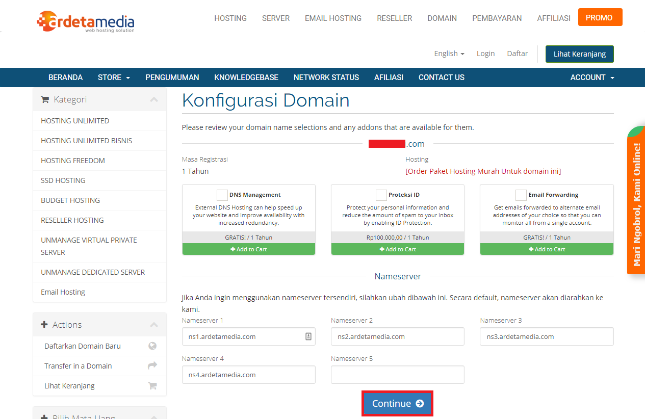 - Jika Anda ingin menggunakan layanan DNS Management, Proteksi ID dan Email Forwarding pada domain, silahkan checklist di kolom yang tertera dan klik “Continue”