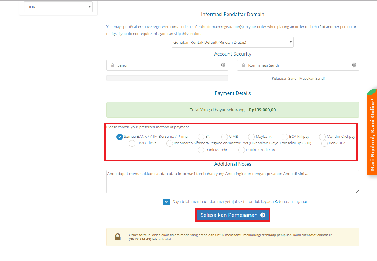 - Pada “Payment Details” silahkan Anda memilih untuk method paymentnya. Anda juga dapat memasukkan catatan atau informasi tambahan. Jika Anda telah membaca dan menyetujui serta tunduk kepada ketentuan dan layanan Ardetamedia silahkan checklist di kolom yang tersedia. Selanjutnya klik “Selesaikan Pemesanan”