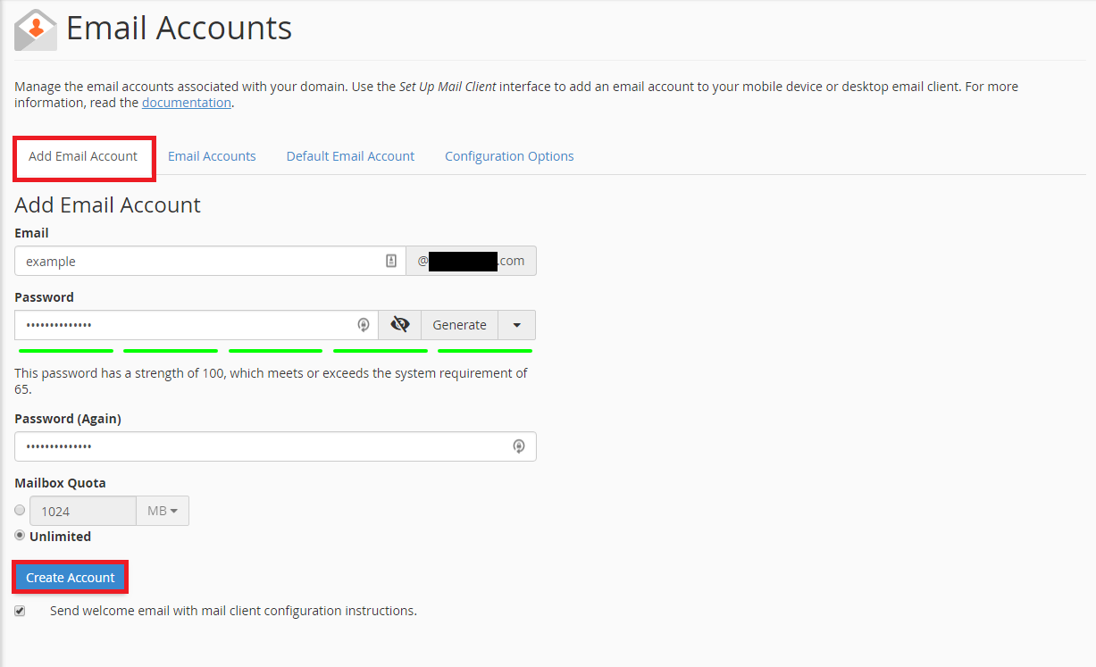 - Mailbox Quota : kapasitas akun email untuk menampung data (pilih unlimited, apabila tidak ingin dibatasi)