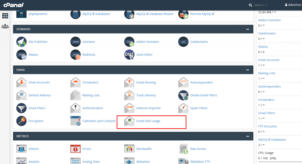 - Login Cpanel dan Pilih Email Disk Usage.
