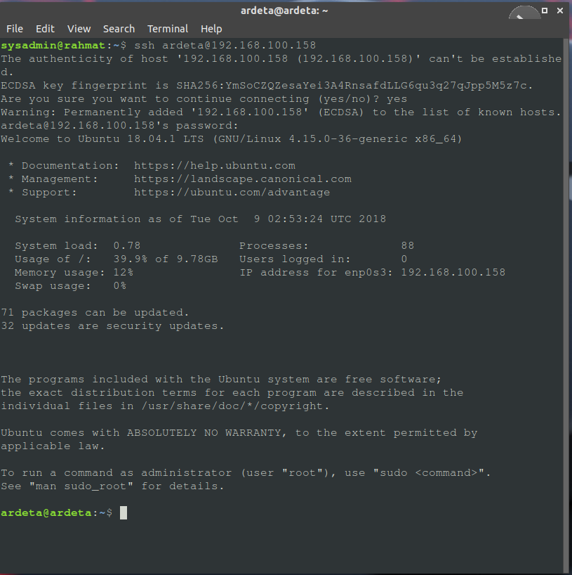 - Jika sudah selesai maka anda bisa mengakses ubuntu server melalui terminal atau putty, seperti gambar dibawah ini.