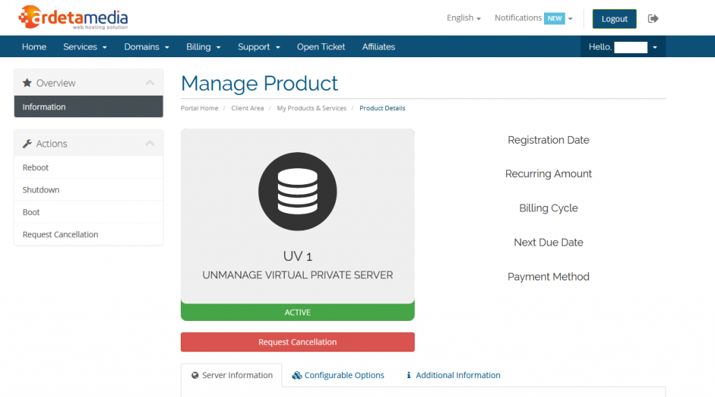 Ada 2 control management yang disediakan, diantaranya kontrol melalui Member Area atau melalui VPS control panel.
