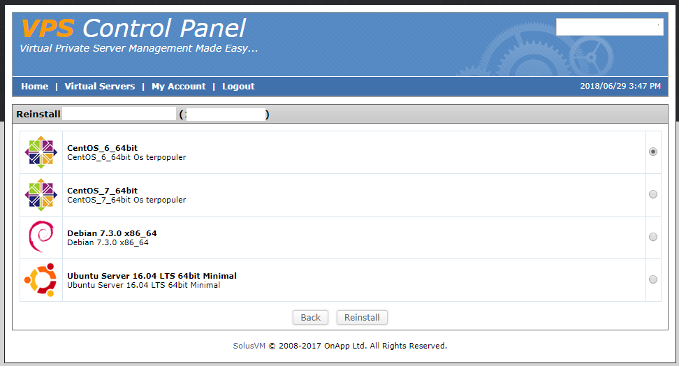 Selain itu member juga dapat melakukan reinstall operating system pada vps server melalui vps panel. Untuk akses login ke vps panel bisa menggunakan link berikut . Username dan password bisa cek pada email installasi VPS.