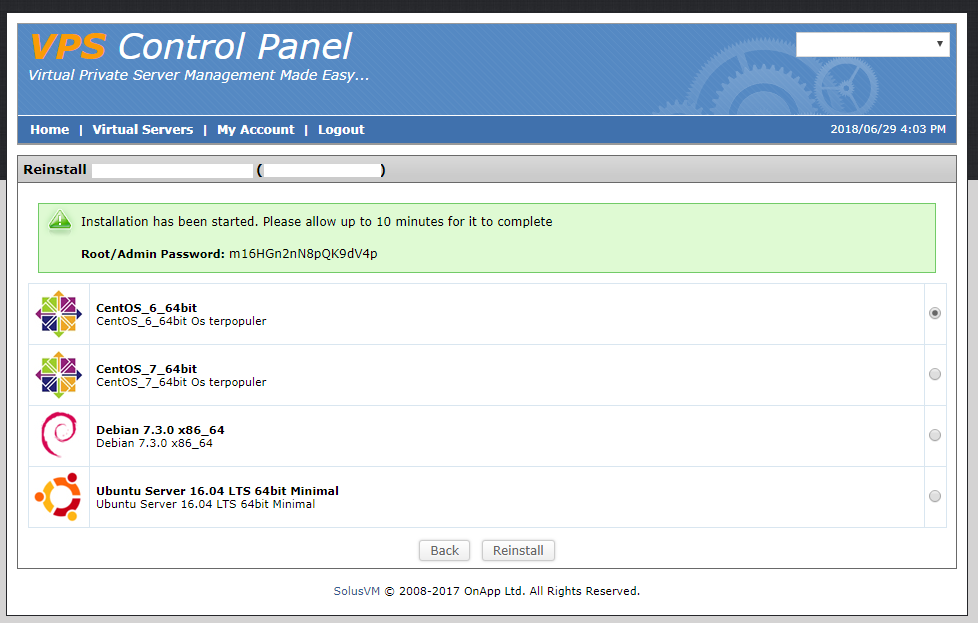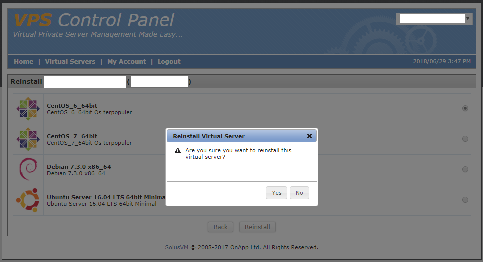 Pada halaman reinstall maka nanti akan tampil list operating system yang dapat dipilih, silahkan pilih sesuai dengan kebutuhan anda kemudian klik “Reinstall” nanti akan muncul popup konfirmasi silahkan pilih “Yes” maka proses install ulang OS akan berjalan dan nanti akan diberikan password baru untuk digunakan login ke server anda.